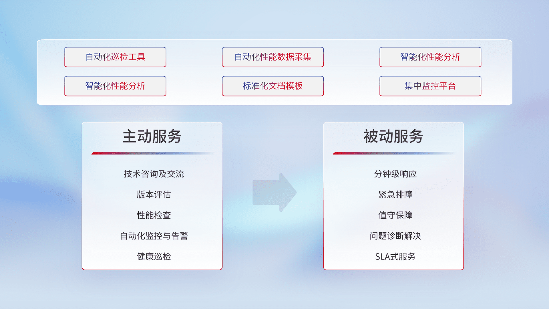 智能化工具和标准化文档,,,保障服务质量,,提供主动服务(包含技术咨询、、版本评估、、、性能检查、、自动化监控与告警、、健康巡检)和被动服务包含(分钟级响应、、、紧急排障、、值守保障、、问题诊断解决、、SLA服务)。。。。